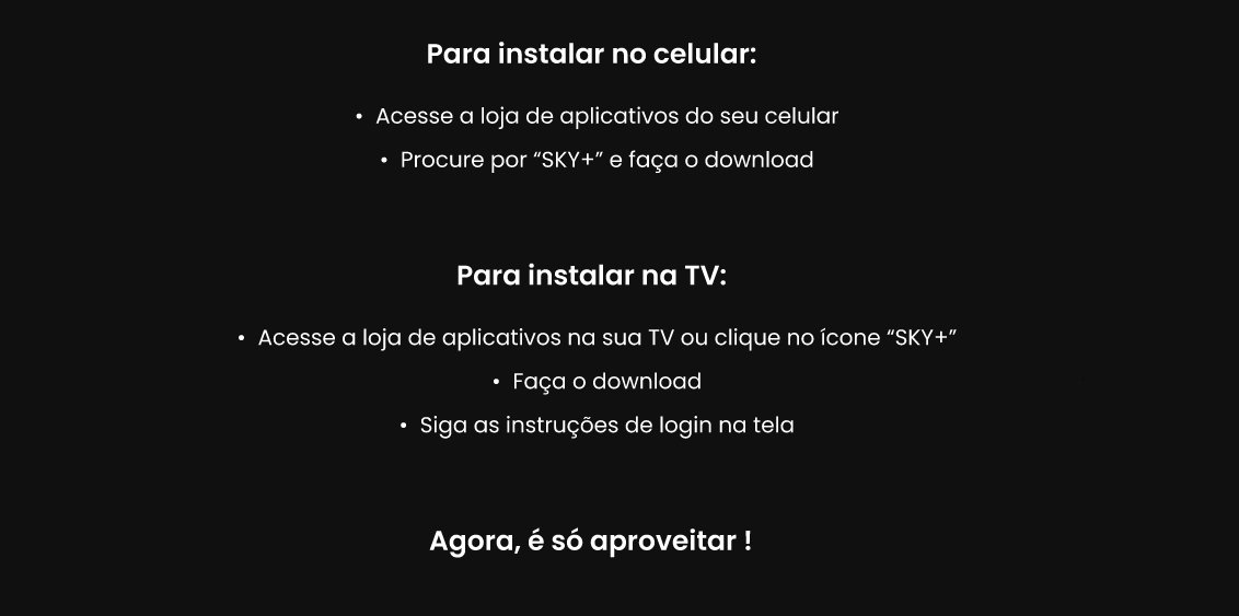 SKY+ é o serviço de streaming da SKY. Com a SKY+, você pode assistir os melhores canais da TV ao vivo, além de conteúdos on demand, como filmes, séries e muito mais, apenas utilizando sua internet. Além disso, não tem burocracia: sem fios e você pode cancelar quando quiser.